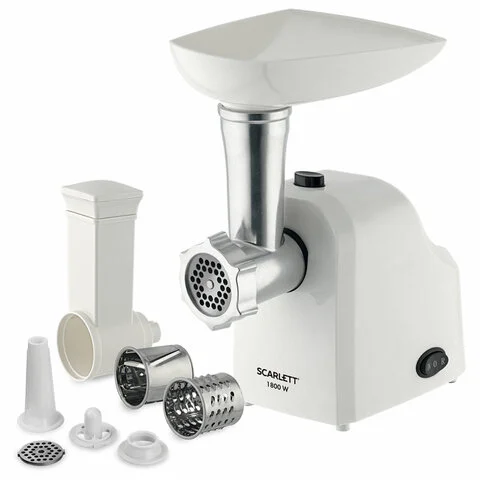 Мясорубка SCARLETT SC-MG45M20, 1800 Вт, производительность 2 кг/мин, 4 насадки, реверс, пластик, бел