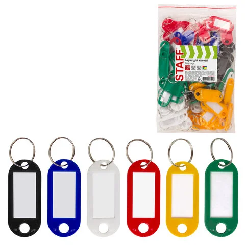 Бирки для ключей КОМПЛЕКТ 100 шт., длина 52 мм, инфо-окно 30х15 мм, цвет ассорти, STAFF, 237730