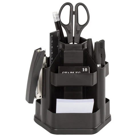Вращающаяся подставка изготовлена из пластика и имеет 8 отделений.В наборе 15 предметов:- подставка,- ножницы,- канцелярский нож,-...