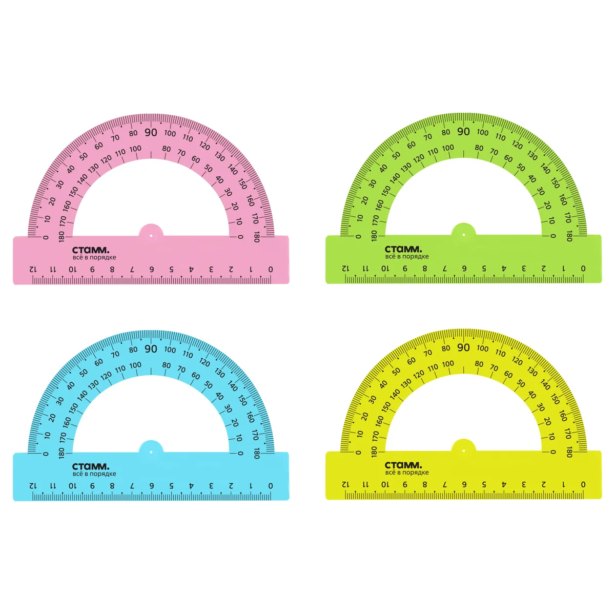 Транспортир 12см, 180° СТАММ, пластиковый, прозрачный, неоновые цвета, ассорти