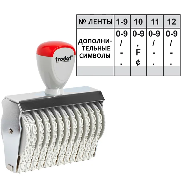 Ленточный колесный механизм позволяет легко устанавливать номер или дату. Обеспечивает 12ми-значный оттиск. Каждая лента содержит ...