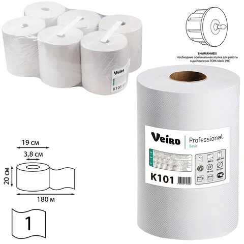 Полотенца бумажные рулонные 180 м, VEIRO (Система H1) BASIC, 1-слойные, цвет натуральный, КОМПЛЕКТ 6