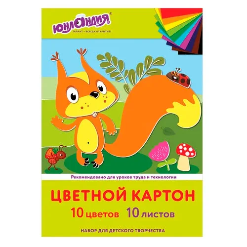 Картон цветной А4 немелованный, 10 листов, 10 цветов, в папке, ЮНЛАНДИЯ, 200х290 мм, 'Бельчонок', 11