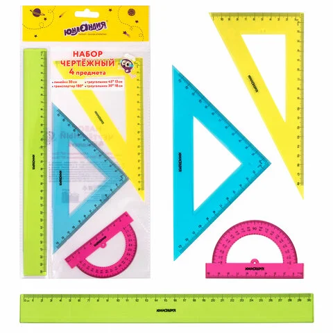 В набор входят:- линейка со шкалой 30 см;- треугольник с углом 30° и шкалой 18 см;- треугольник с углом 45° и шкалой 13 см;- транс...