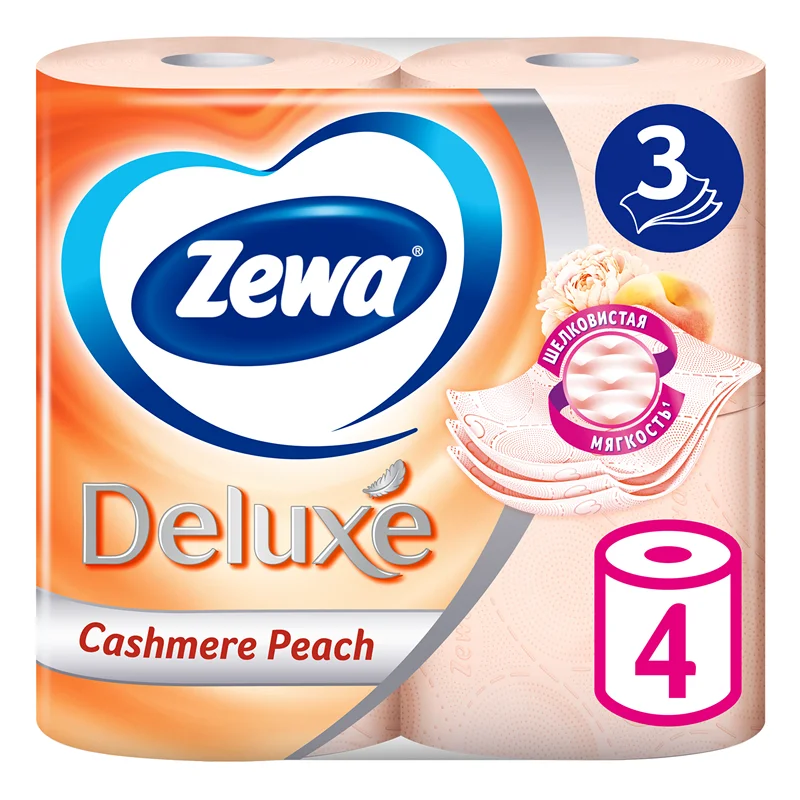 Туалетная бумага Zewa Deluxe персик, 3 слоя, 4 рулона, 21 м, оранжевая