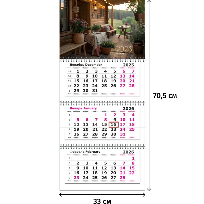 Настенный трехблочный календарь формата 33x70.5 см. Общий размер изделия составляет 330x705 мм. Изготовлен из офсетной бумаги плотностью 80 г/кв.м, печать выполнена в 2 цвета. Обложка выполнена из мелованного картона плотностью 300 г/кв.м, размером 330x225 мм. Крепление осуществляется на три гребня.