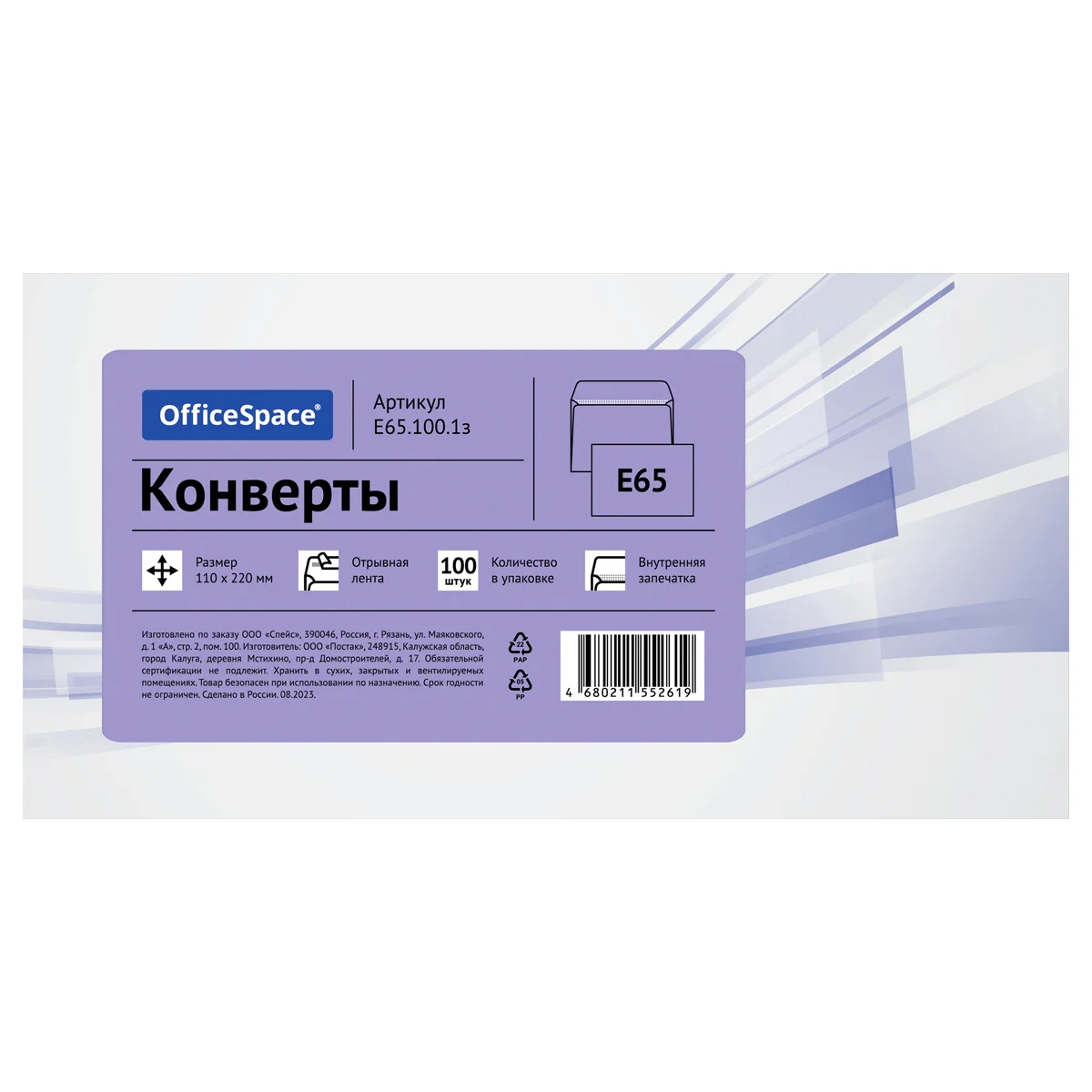 Конверт E65, OfficeSpace, 110*220мм, б/подсказа, б/окна, отр. лента, внутренняя запечатка, 100шт
