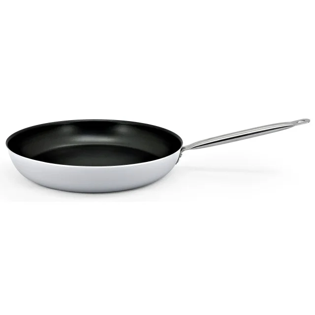 METRO PROFESSIONAL Сковорода Deep, 40 см идеально подходит для приготовления мяса, рыбы, овощей. Она имеет диаметр 40 сантиметров и изготовлена из качественных материалов. Благодаря прочному алюминию сковорода долговечна и устойчива к повреждениям. На ее поверхности есть антипригарное покрытие, которое облегчает очистку и предотвращает пригорание. Готовьте на ней оладьи, запеканки, жаркое, тушите мясо и овощи или еще что-то. Ухаживайте за сковородой правильно, чтобы она прослужила долго. Не используйте сухие чистящие средства и губки с абразивными частицами, которые могут испортить покрытие. Также не стоит ставить горячий прибор на мокрую или холодную поверхность — это может привести к его деформации. Сковорода имеет термоаккумулирующее дно, которое равномерно распределяет тепло и обеспечивает идеальную прожарку. Ее можно использовать в духовке при температуре до 220 градусов.