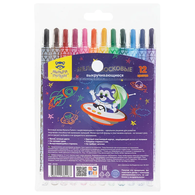 Набор из 12 выкручивающихся восковых мелков «Мульти-Пульти» серии «Енот в космосе» предназначен для детского творчества. Утолщенны...