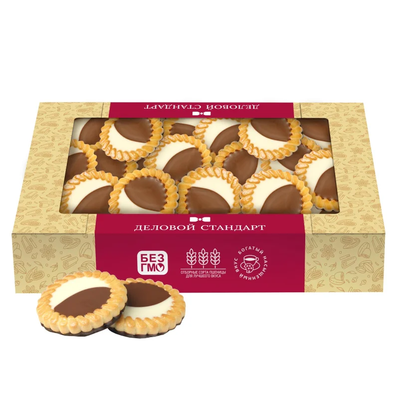 Печенье «Деловой Стандарт» «Неробьянко» — сдобное печенье, дополненное затейливым сочетанием двух кремов (молочного и шоколадно-орехового) в начинке. Донышко печенья покрывается шоколадной глазурью.