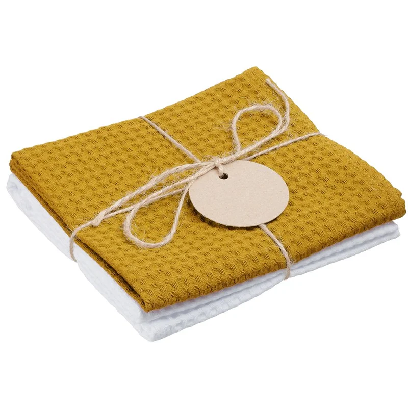 В набор входят 2 кухонных полотенца, перевязанных бечевкой с картонной биркой, на которую можно нанести логотип. Цвет - желтый. Размер: 35х65 см. Материал: хлопок 100%. Возможные виды нанесения: Наклейка; Вышивка; Шелкография с трансфером; Шелк.с трансфером на ленту ; Вышивка; Шелкография (1 цвет)