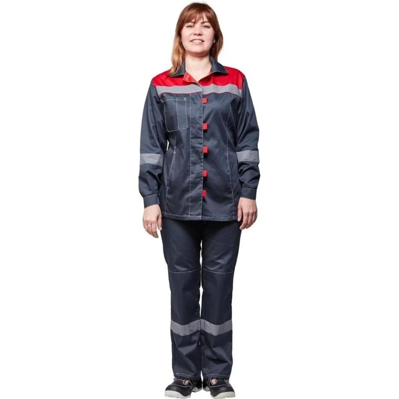 Костюм рабочий летний женский л20-КБР с СОП серый/красный (размер 52-54, рост 158-164). В состав входит куртка и брюки. Предназначен для использования в сферах логистики, строительства, ЖКХ, сельского хозяйства, легкой промышленности и озеленения.