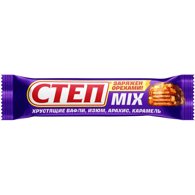 Шоколадный батончик Степ Mix 40 г (20 штук в упаковке). Хрустящий вафельный батончик с изюмом, арахисом и карамелью, покрытый молочной глазурью.