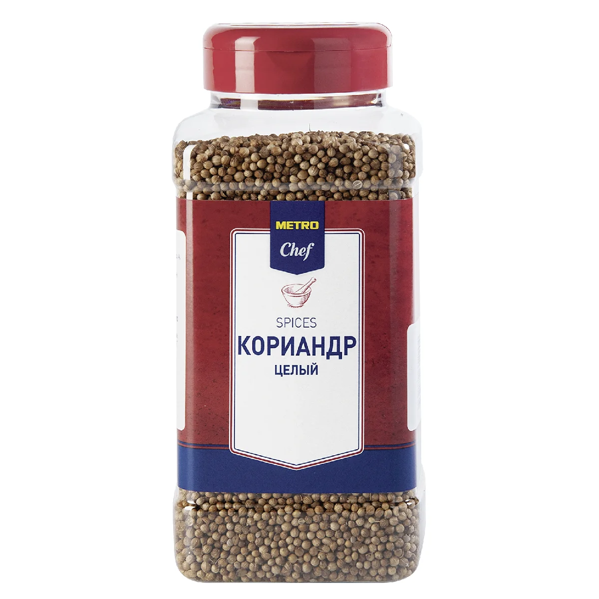 METRO Chef Кориандр целый, 280г — семена травянистого растения кинзы. Они отличаются относительно большим размером и округлой формой (обычно целые семена кориандра можно увидеть на бородинском хлебе). Кориандр характеризуется насыщенным вкусом, сочетающим в себе сладкий, горький и острые оттенки, а его аромат — свежий и приятный с древесными нотками. Представленная специя содержит в своем составе много витаминов (А, С, Е, PP, группа В), макро- и микроэлементов (кальций, калий, фосфор, магний, цинк, медь и многие другие). Также кориандр богат эфирными маслами, отвечающими за его превосходный запах. Эта приправа благоприятно влияет на работу всего организма: улучшает пищеварение, повышает аппетит, нормализует работу печени, выводит шлаки, борется с отеками, регулируя водно-солевой баланс и обмен веществ. В качестве добавки в блюда кориандр широко применяется во всем мире. Его используют при приготовлении первых блюд, гарниров, мяса, рыбы, овощных салатов. Особенно хорошо пряность сочетается с супами и кашами из тыквы, моркови и свеклы. С ее помощью можно ароматизировать напитки, в том числе и алкогольные, например, ликер. Также кориандр применяется в хлебобулочной промышленности. Для того, чтобы данная приправа не утратила свои свойства, хранить ее рекомендуется в герметичных емкостях.