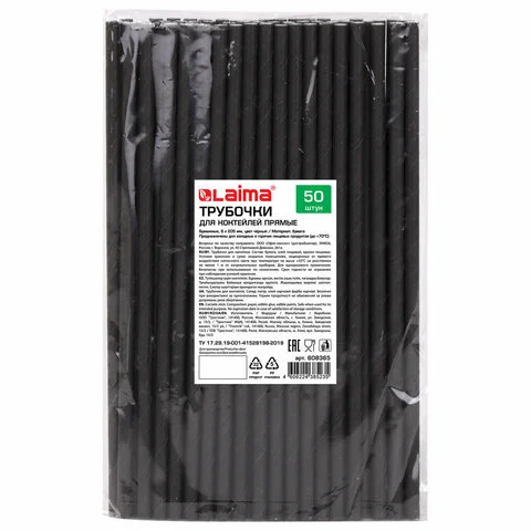 Трубочки для коктейлей бумажные, прямые, 6х205 мм, черные, комплект 50 штук, LAIMA, 608365