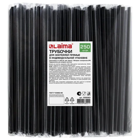 Трубочки для коктейлей прямые в индивидуальной упаковке, 8х240 мм, черные КОМПЛЕКТ 250 штук, LAIMA,