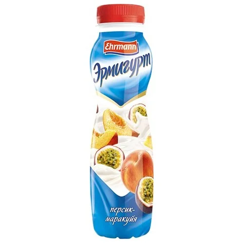 Йогурт питьевой Эрмигурт Персик-Маракуйя Ehrmann (Эрманн). Питьевые йогурты стали настоящим открытием для современного городского человека, потому что теперь справиться с чувством голода можно прямо на ходу - для этого и был создан питьевой йогурт 'Эрмигурт ' с персиком и маракуйей. Кисломолочные продукты славятся положительным влияением на наш организм, поэтому 'Эрмигурт' с персиком и маракуйей не только утолит голод, но и также нормализует работу кишечника и улучшит самочувствие. Объем: 290г, жирность 1,2%