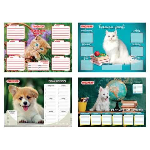 Расписание уроков и звонков А4, ПИФАГОР, 'Домашние любимцы', ассорти (4 вида), бумага 150 г/м2, 1116