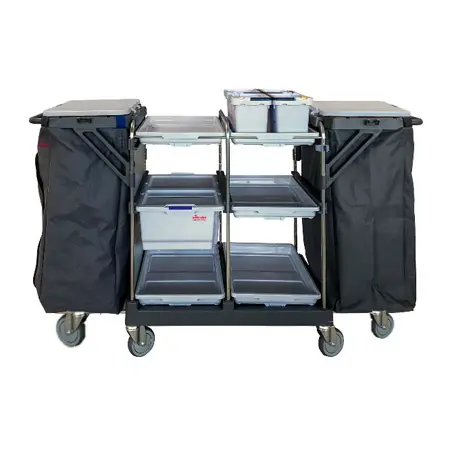 Комплектация тележки для горничной 700003:Тележка комплексная Ориго300 HHX на базе СВЕП - 1 шт (артикул 120794)Чехол для мусорных ...