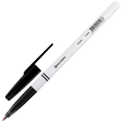 Ручка шариковая BRAUBERG 'Офисная', ЧЕРНАЯ, корпус белый, узел 1 мм, линия письма 0,5 мм, 140890
